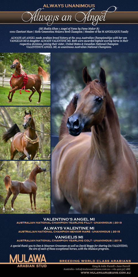 Over the last quarter century, the family of M ANGELIQUE has been a prolific source of some of the most talented and accomplished Arabian show horses and athletes produced in Australia. An impressively large majority of these same horses have gone on to have a significant impact as breeding horses, making this “Family of Angels” one of the most valuable and influential within the Mulawa program.