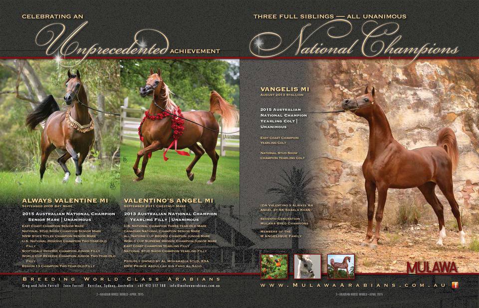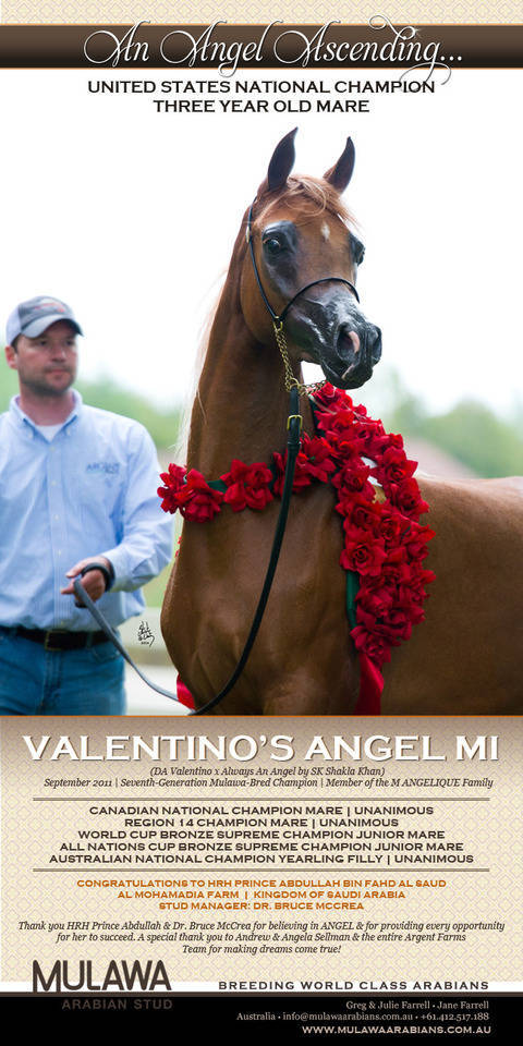 VALENTINO’S ANGEL continued to hop continents in early 2014, arriving in North America a year older than her elder sister during her competition year. Her first success was at the Arabian Breeders world Cup in Las Vegas, earning the titles of Reserve Champion Three Year Old Mare and Supreme Bronze Champion Junior Mare. With Andrew Sellman once again at the lead, ANGEL won her next successive titles by unanimous decision: Region 14 Champion & Canadian National Senior Champion Mare. These impressive wins gave VALENTINO’S ANGEL the momentum needed for her most important North American competition: the United States National Championships. Winning in grand style and taking home Champion Three Year Old Filly honours, VALENTINO’S ANGEL became the first Mulawa-bred horse to claim the coveted title of US National Champion.