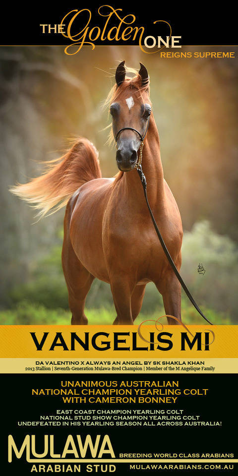 Just as ANGEL was capping off a phenomenally successful show year in North America for Al Mohamadia, the most recent of the ALWAYS AN ANGEL x DA VALENTINO crosses was about to make his debut on home turf a few weeks later. This was VANGELIS MI, born 31st August 2013, a commanding young colt of impressive size and scope, possessing the show ring presence and superlative build of his celebrated sire, coupled with the aristocratic quality and refinement, harmonious balance and effortless athleticism of his acclaimed dam. Blessed with enormous eyes, a astoundingly long, clean, shapely and upright neck, faultless structure and an intense desire to please, VANGELIS has been an undefeatable superstar in the show ring, repeating the successive wins of older sister VALENTINO’S ANGEL in the colt division as National Stud Show, East Coast & Australian National Champion Yearling Colt, an Australian first for full siblings. He won each of these titles at the same shows where his elder sister ALWAYS VALENTINE was named Senior Champion Mare, another first for full siblings, made even more impressive by the fact the each feat was accomplished with a different full sister. VANGELIS’ Australian National Champion title was won not only by unanimous decision, but with the highest score of the entire show, besting the score of every male entry at the show in every single category. VANGELIS was the undisputed crowd favorite of the entire National Show, and just a few days later, a bonafide superstar at the annual Vesty photo shoot with Cameron Bonney at the lead, the man who, remarkably, has shown all three of the full siblings to their unanimous Australian National Championship titles.