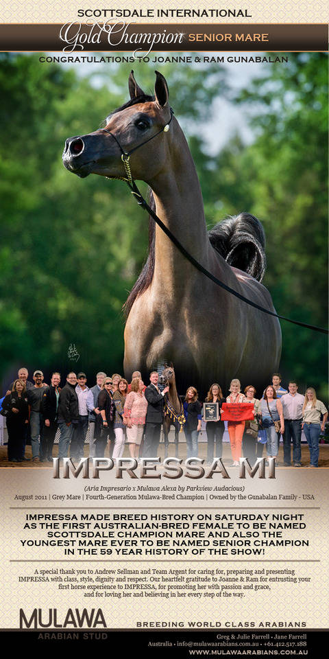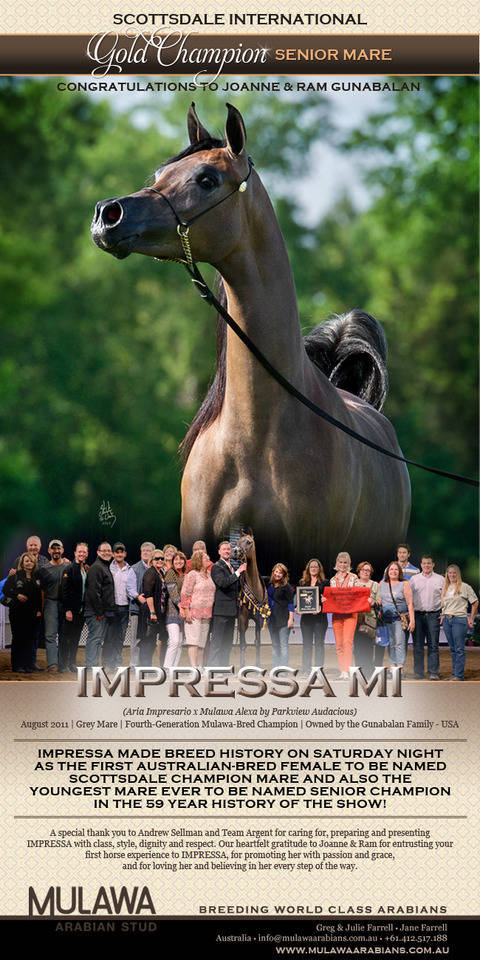 A special thank you is due to all the many professionals - breeders, trainers, owners and friends alike - who have made IMPRESSA's success a reality. To the LaCroix Family and Lasma (USA), for introducing LM MAGICS GIFT, IMPRESSA's great-grandmother, to the Farrell Family. To Dr. Hans Nagel (Germany) for agreeing to sell the Janow Podlaski-bred EUNI in foal to JAMIL to Greg Farrell Sr, who in turn produced the Mulawa foundation sire VISION. To the Bonney Family (Australia), for breeding PARKVIEW AUDACIOUS, IMPRESSA's maternal grandsire, and for allowing him to have a positive and pervasive impact throughout the Mulawa breeding program. To Jeff Sloan (USA), for sharing ARIA IMPRESARIO with the Mulawa program and believing in the unknown IMPRESSA, and to Michael Byatt (USA), for first introducing the young superstar to the Sloan Family in 2007. To Andrew & Angela Sellman, and the entire incredibly capable Team at Argent Farms (USA), for caring for, preparing and presenting IMPRESSA with class, style, dignity and respect. And finally, to the Gunabalan Family (USA), for entrusting your first horse experience to IMPRESSA, and for promoting her with passion and grace, and for loving her and believing in her every step of the way.