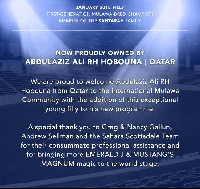 We are proud to welcome Abdulaziz Ali RH Hobouna from Qatar to the international Mulawa Community with the addition of this exceptional young filly to his new programme. A special thank you to Greg & Nancy Gallun, Andrew Sellman and the Sahara Scottsdale Team for their consummate professional assistance and for bringing more EMERALD J & MUSTANG'S MAGNUM magic to the world stage.