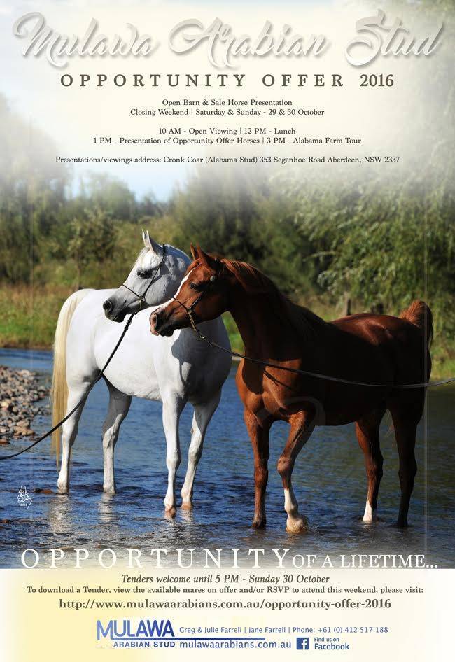 Attendance is NOT mandatory to submit a tender for any of the available mares/fillies. All Prospective Buyers interested in submitting a tender to purchase any horse available in Mulawa Opportunity Offer 2016 must register and complete a Tender Agreement. By lodging a Tender Agreement, the Registered Buyer agrees, in submitting a Tender for the Horse listed, to commit to purchasing said Horse for the submitted Purchase Price in the event the Tender Offer is formally accepted by Mulawa Arabian Stud.